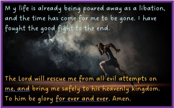 M y life is already being poured away as a libation, and the time has come for me to be gone. I have fought the good fight to the end; I have run the race to the finish; I have kept the faith; all there is to come now is the crown of righteousness reserved for me, which the Lord, the righteous judge, will give to me on that day; and not only to me but to all those who have longed for his appearing. The first time I had to present my defence, there was not a single witness to support me. Every one of them deserted me – may they not be held accountable for it. But the Lord stood by me and gave me power, so that through me the whole message might be proclaimed for all the pagans to hear; and so I was rescued from the lion’s mouth. The Lord will rescue me from all evil attempts on me, and bring me safely to his heavenly kingdom. To him be glory for ever and ever. Amen.