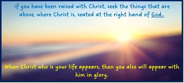 Brothers and Sisters: If you have been raised with Christ, seek the things that are above, where Christ is, seated at the right hand of God. Set your minds on things that are above, not on things that are on earth. For you have died, and your life is hidden with Christ in God. When Christ who is your life appears, then you also will appear with him in glory.